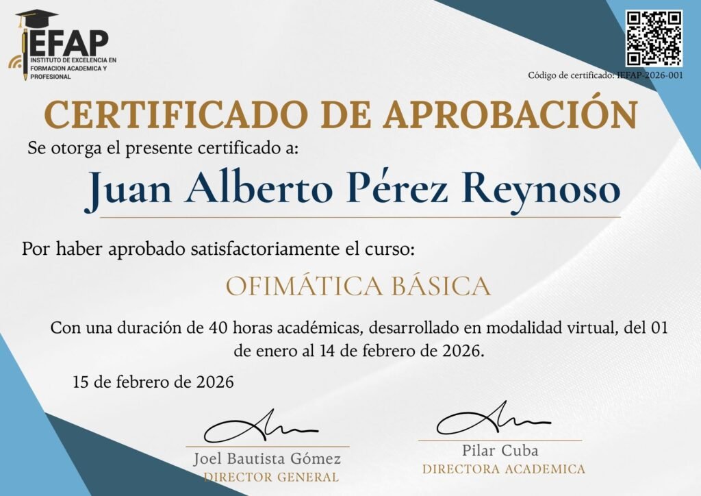 Cada certificado emitido por IEFAP incluye los datos del participante, nombre del programa, duración académica, fecha de emisión y firma institucional, fortaleciendo su perfil formativo y profesional.